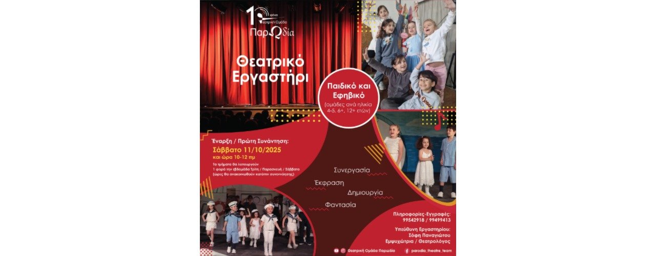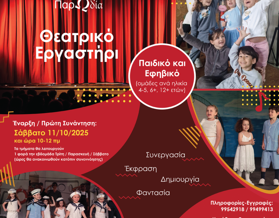 Θεατρικό Παιδικό & Εφηβικό Εργαστήρι Οι εγγραφές για τη νέα χρονιά στο θεατρικό μας εργαστήρι ξεκίνησαν και συνεχίζονται! Θα λειτουργήσει παιδικό και εφηβικό τμήμα υπό την […]