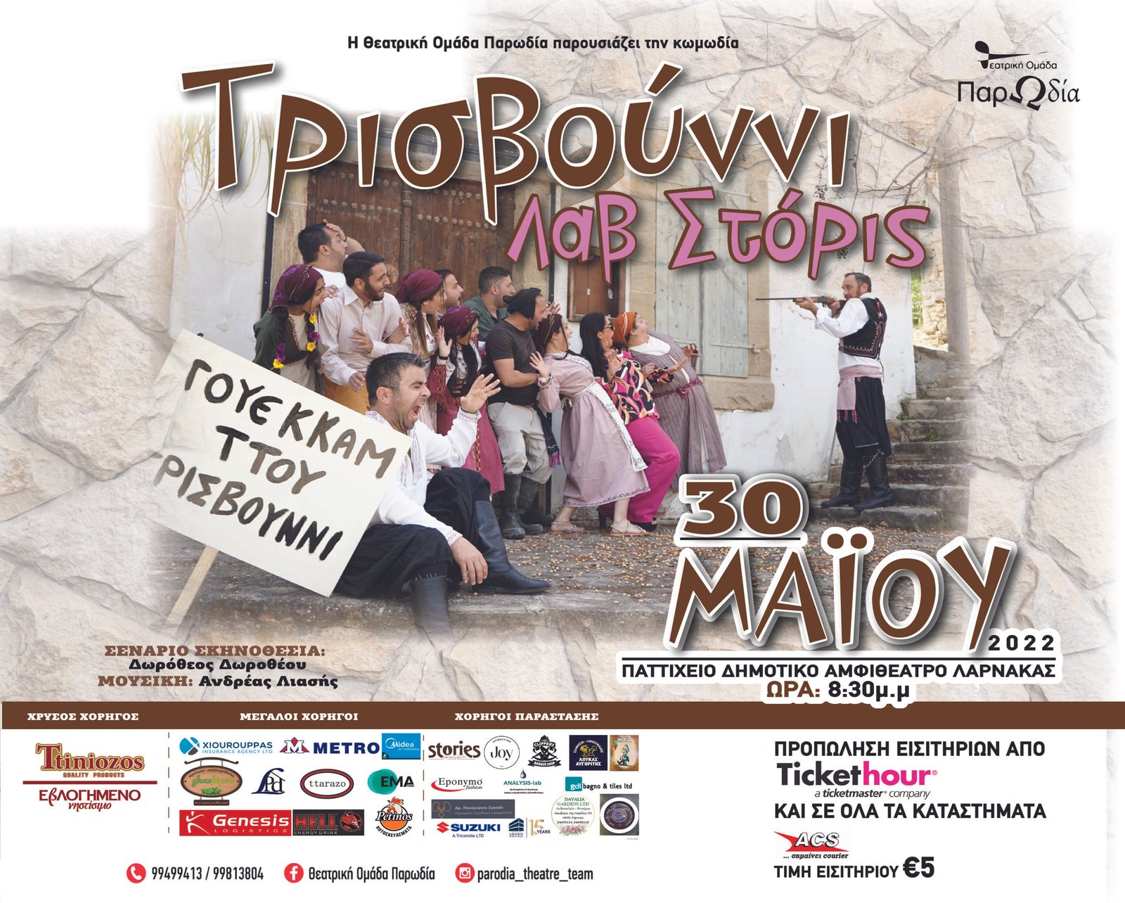 Το έργο διαδραματίζεται σε μια Κύπρο πιο «παραδοσιακή», με στολές εποχής και την κυπριακή τοπολαλιά σε πρώτο πλάνο, που παρασέρνει το κοινό σε ένα ταξίδι πίσω στο χρόνο μέσα από ευτράπελες και κωμικές καταστάσεις. Ένα χωριό με ιδιόμορφους κατοίκους, μια αναπάντεχη επίσκεψη, γαμπροί που δεν πληρούν τα «κριτήρια» και «απαγορευμένοι έρωτες» αποτελούν τα συστατικά της κωμωδίας «Τρισβούννι Λαβ Στόρις». Παντρεύοντας το παρελθόν με το μέλλον, σε ένα ιδιόμορφο και διασκεδαστικό ιδίωμα κυπριώτικου σκετς, το «Τρισβούννι Λαβ Στόρις» μας μεταφέρει σε μια Κύπρο αλλιώτικη, αυθεντική, συντηρητική αλλά συνάμα γεμάτη συναισθήματα.